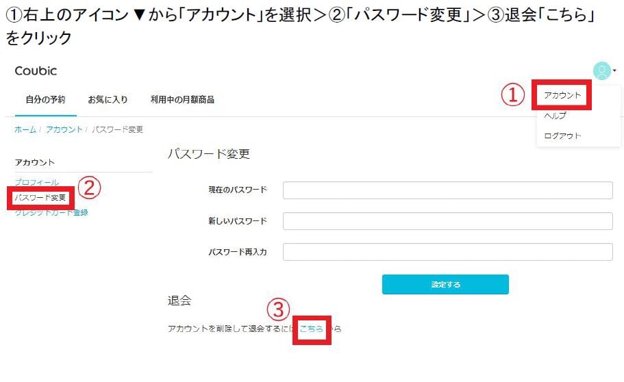 1・①右上のアイコン▼から[アカウント]を選択>②[パスワード変更]③退会[こちら]